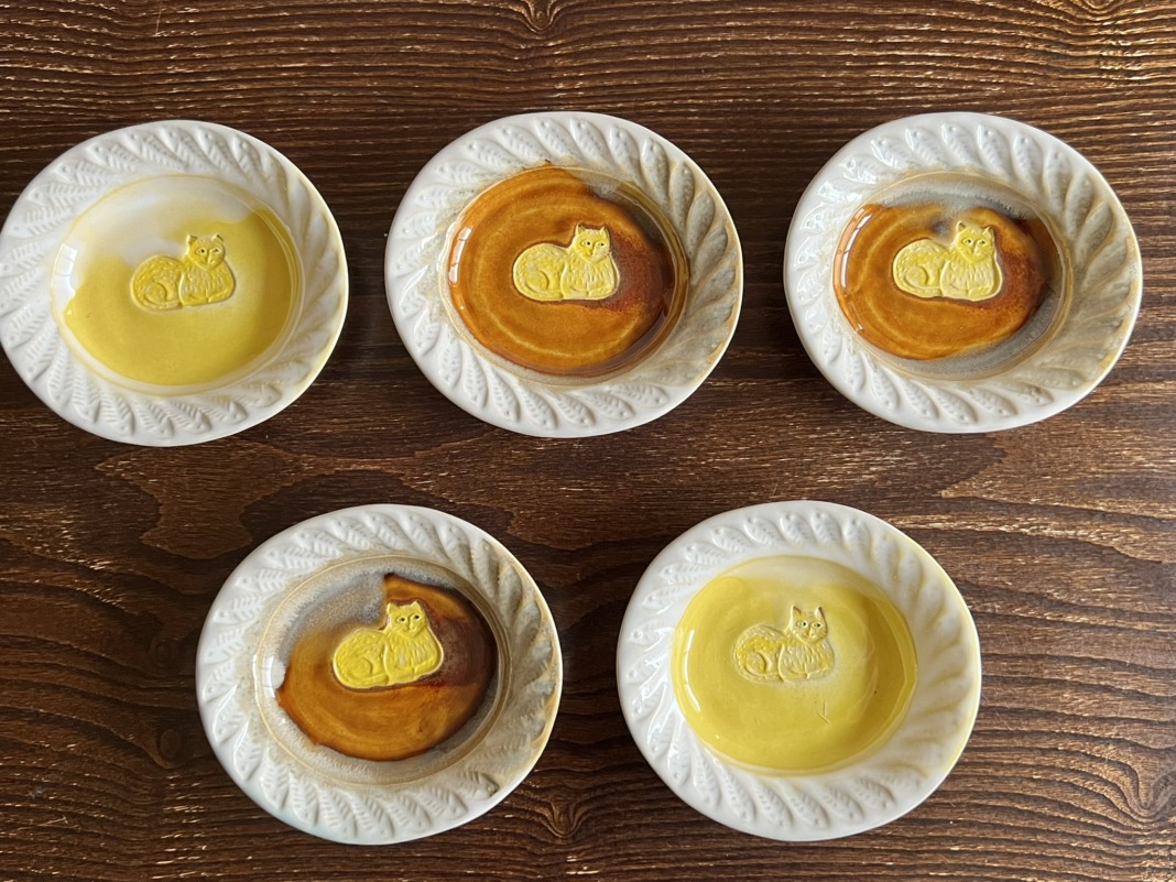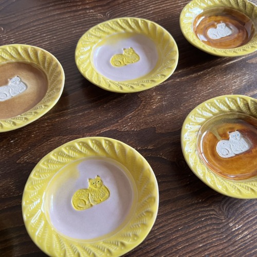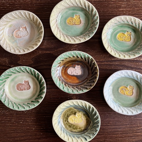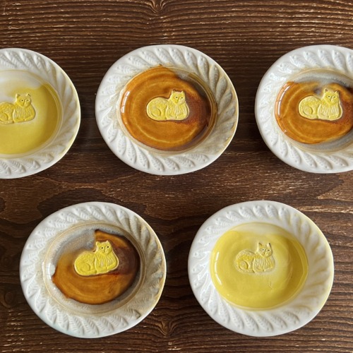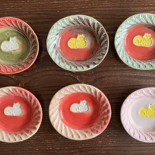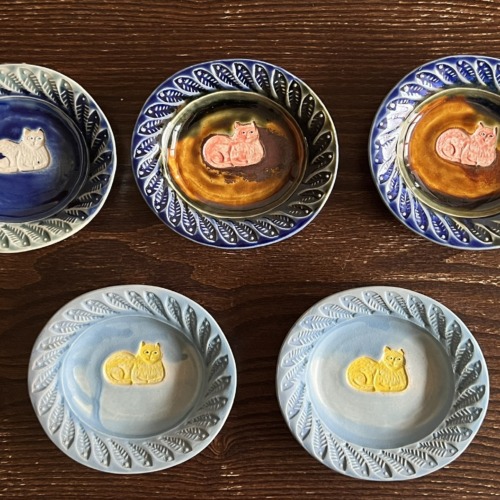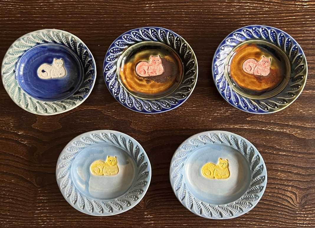 赤水窯・熊本象さんの人気のカラフルな猫&魚の印花ミニ皿です。