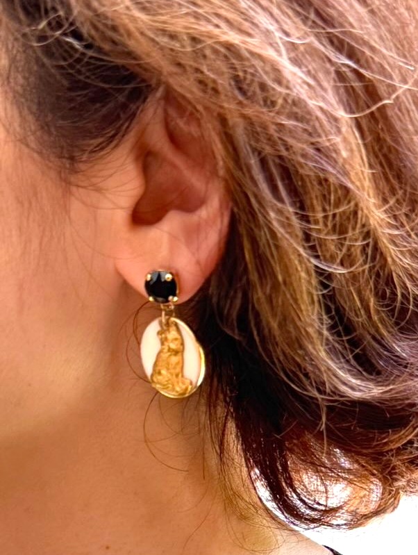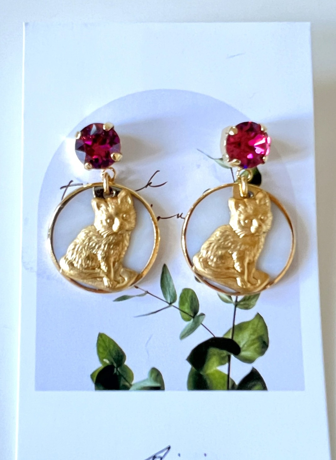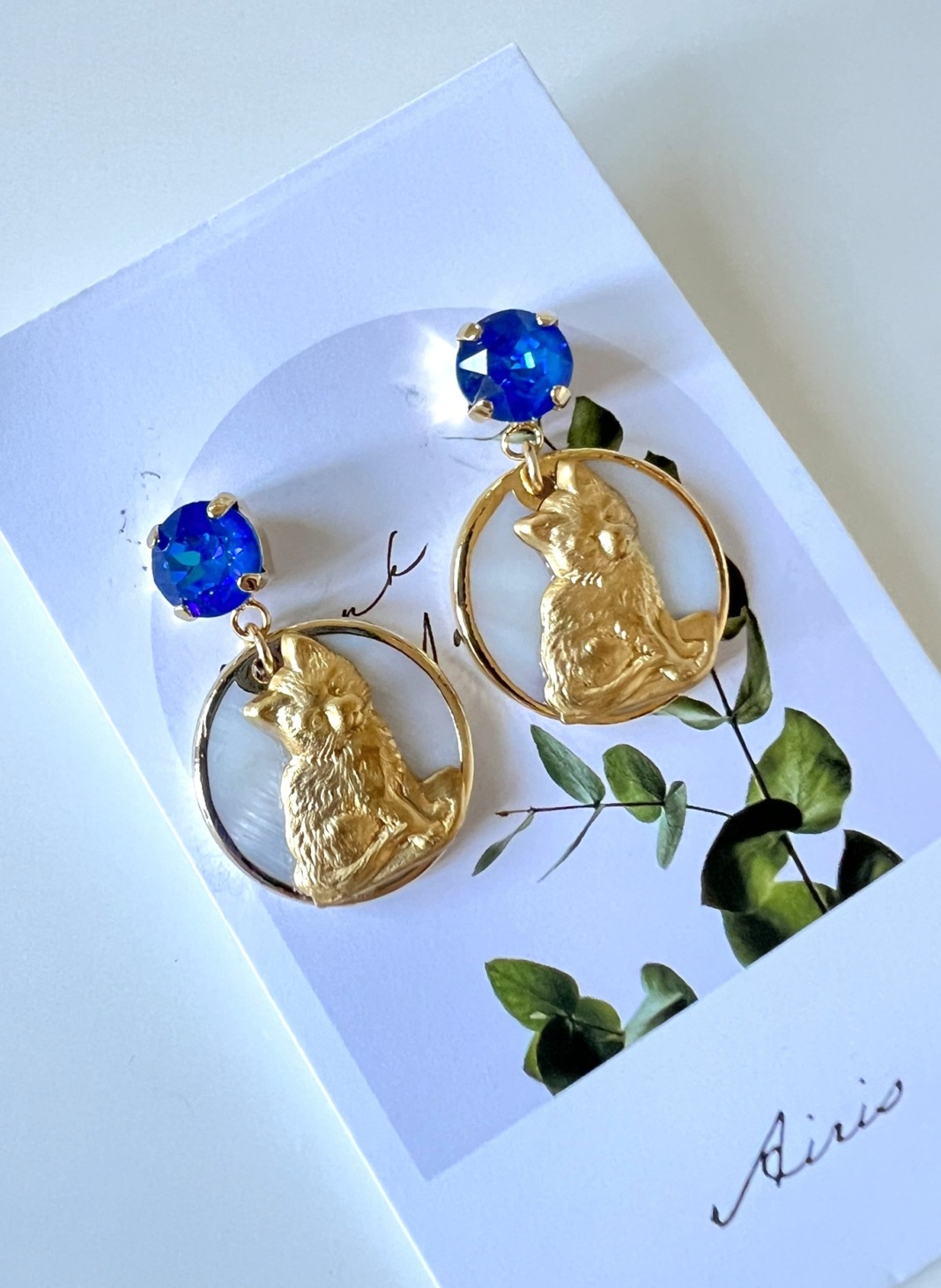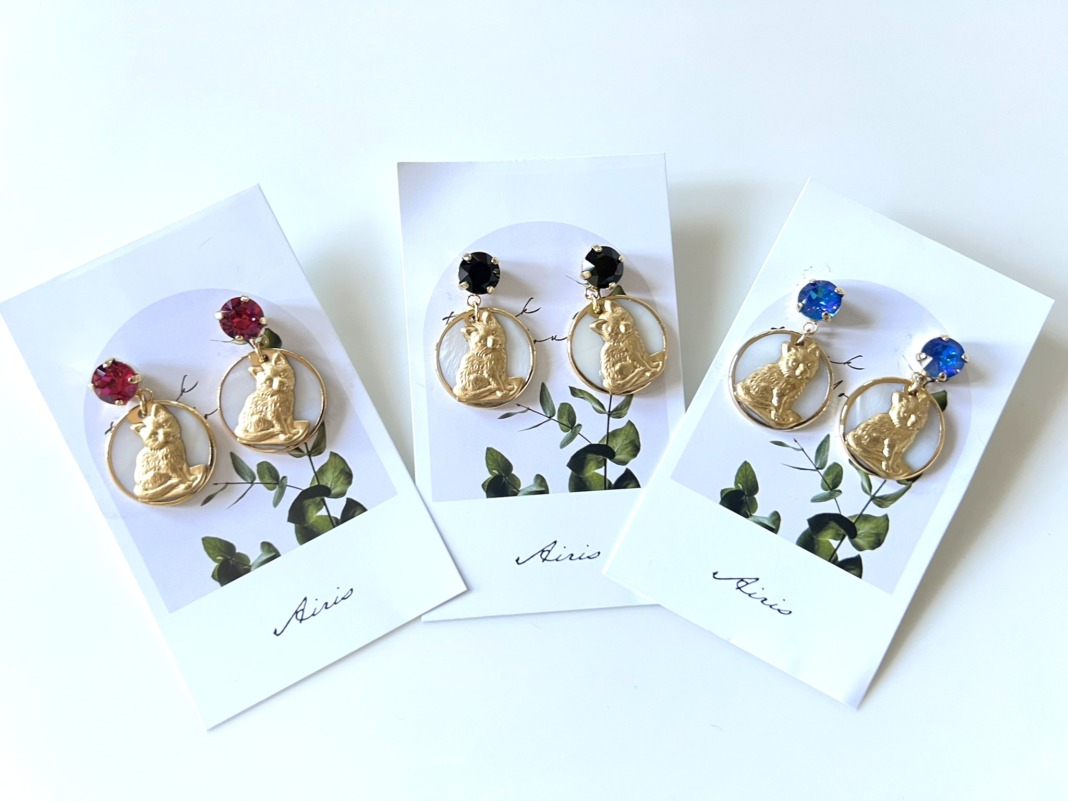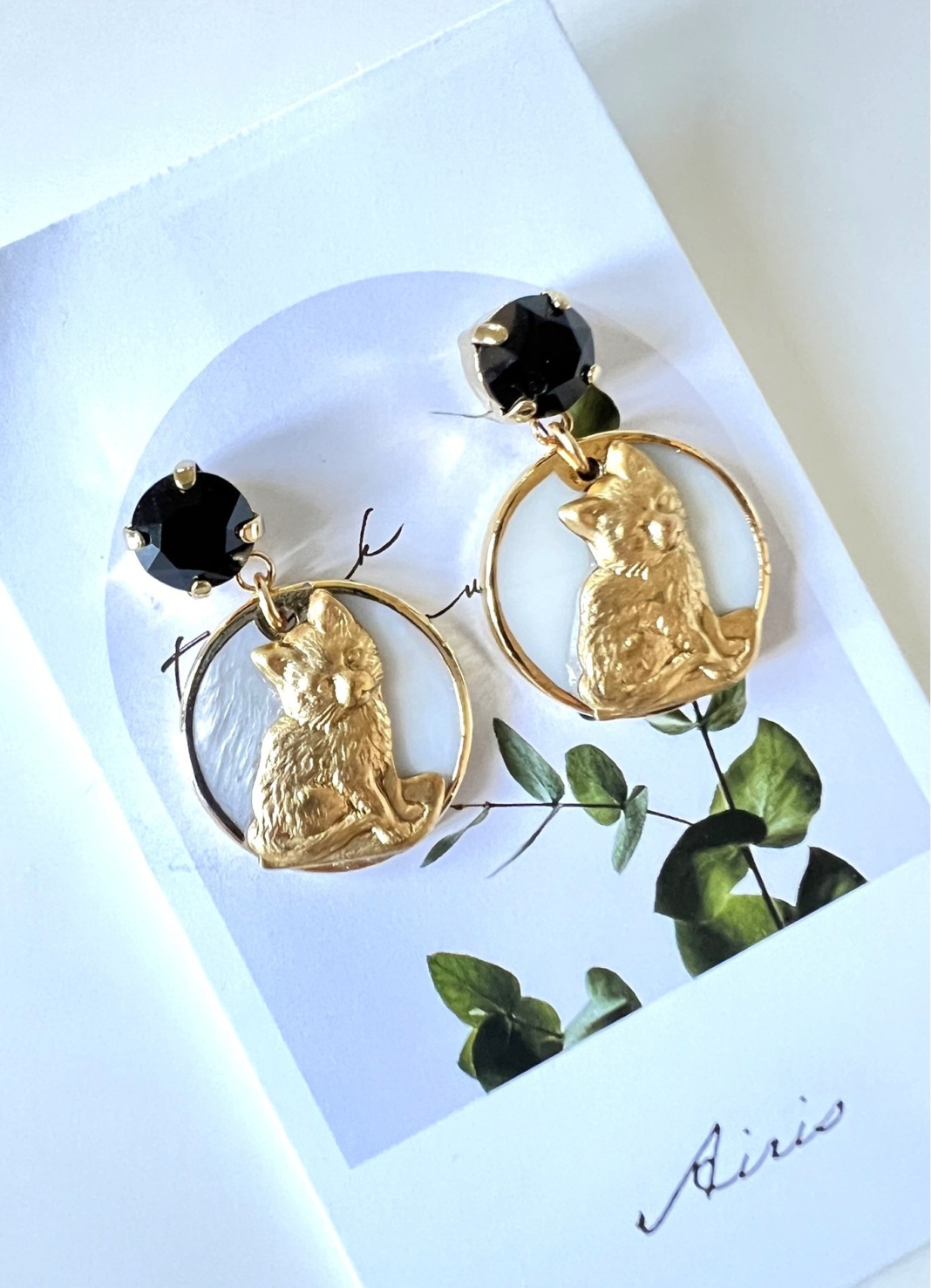 ビーズ作家のAirisさんの新製品。シェルに真鍮製の猫が鎮座しているお洒落なピアスです。猫の上には「Etoile=星」に見立てた、輝くスワロフスキーのクリスタルビーズが。大人のための遊び心あふれるピアスです。