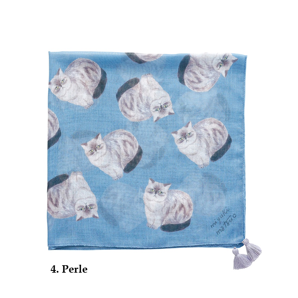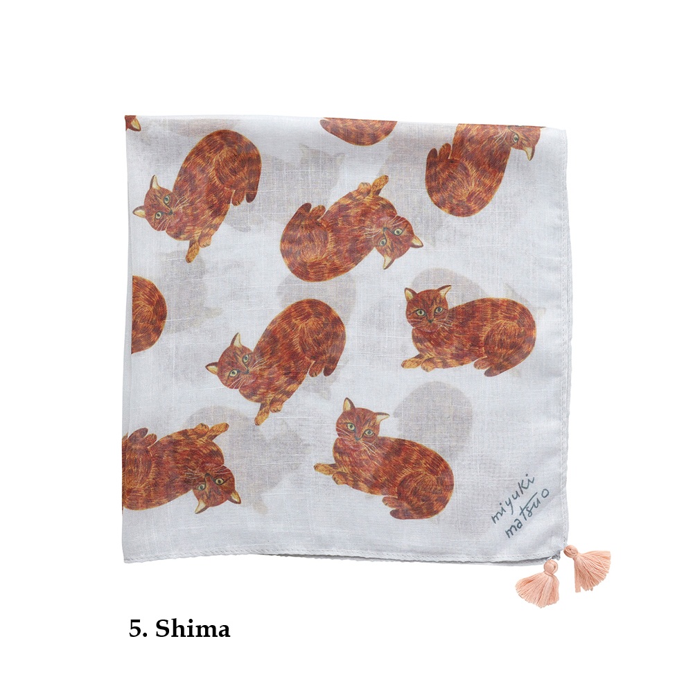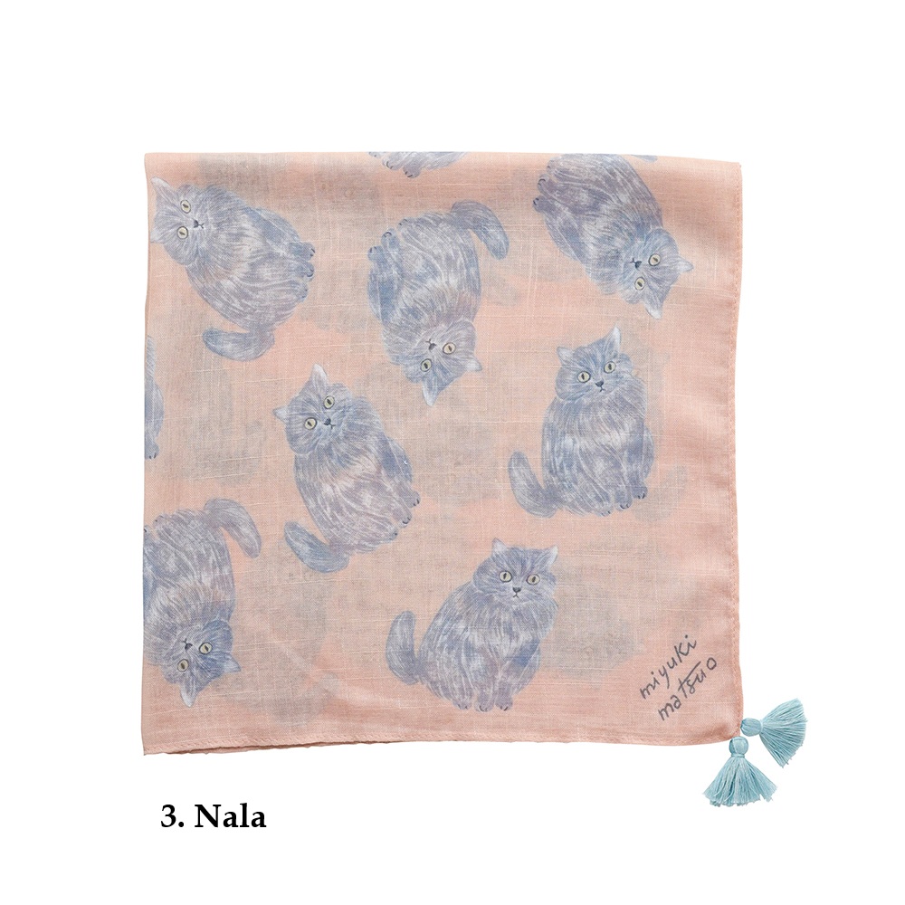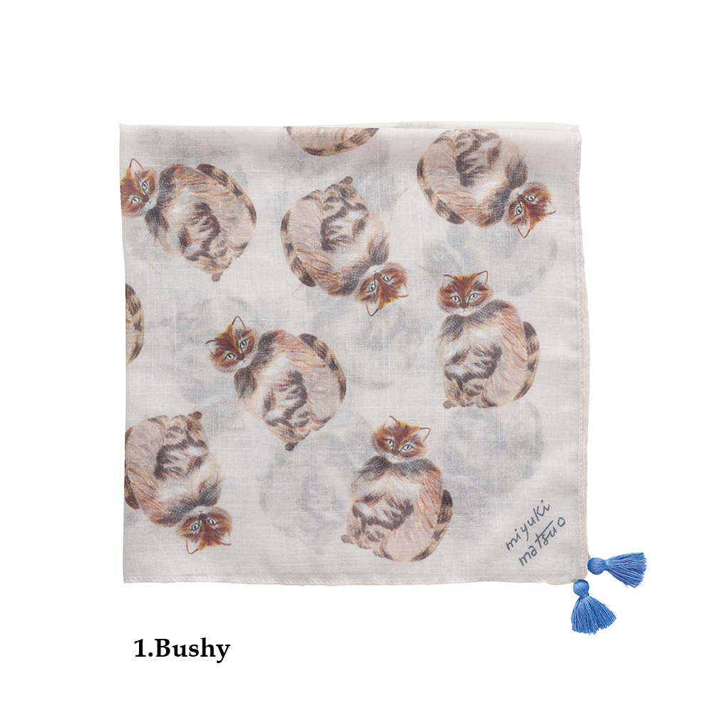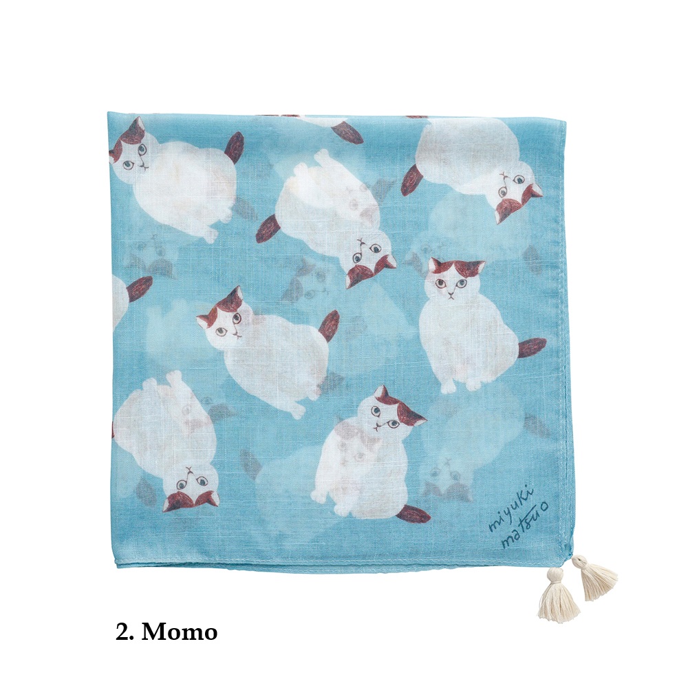 松尾ミユキさんの描く可愛らしいネコたちの、ふわっと柔らかな大き目サイズのクロスです。クロスの角2か所にはタッセルをあしらい、全体的に落ち着いたトーンで仕上げました。