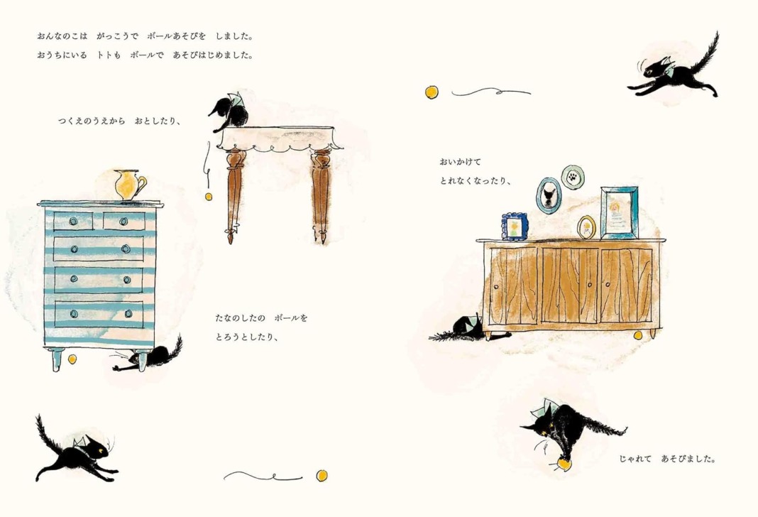 一番小さな黒猫のトトは、ボールを追いかけたり、紙を引っかいて穴をあけたり、遊ぶのが大好き。