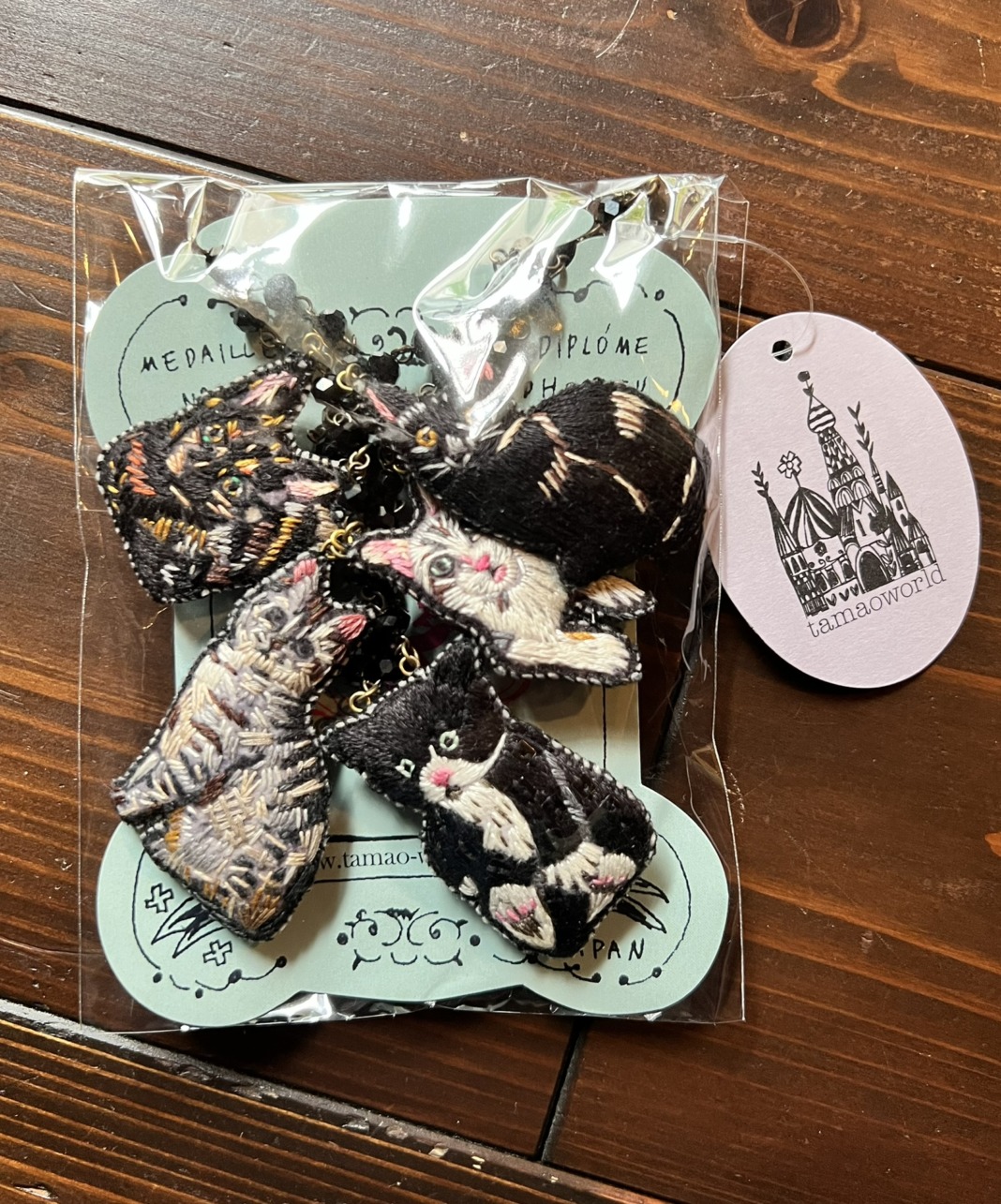 ひとつひとつ丁寧な刺繍によって作られているネックレス。5匹の猫ちゃんは保護猫がモデルとなっています。チェーン部分はプラスチック製のビーズなので、軽い付け心地です。