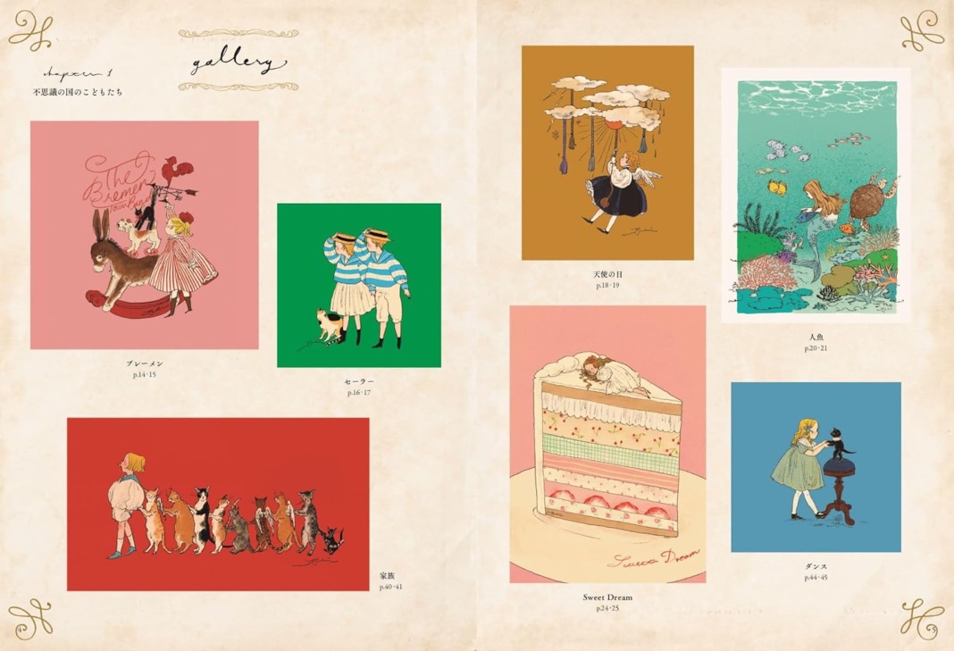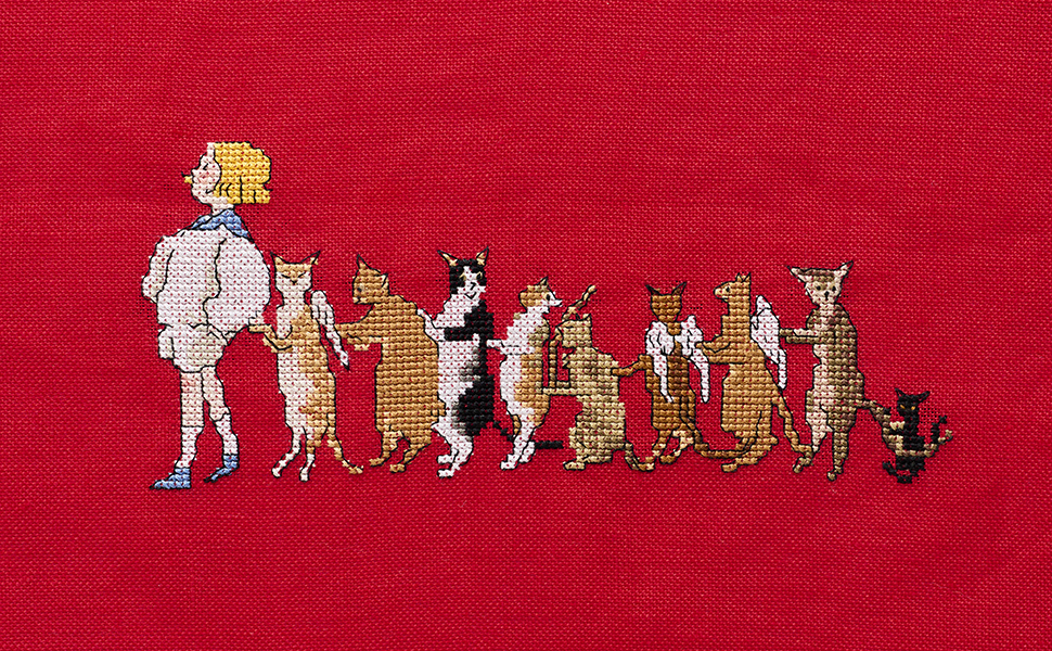こどもや動物、いろいろな表情を見せるねこたち、季節のこどもたちなど、くらはしさんならではのイラストを刺しゅうで描きました。どこか不思議なイラストを、刺し進めていくと、秘められたものがたりがみえてきます。ほどよい甘さを纏った女の子のファッションにも注目です。クロスステッチの上からバックステッチなどでアウトラインをとっているため、繊細な仕上がりです。