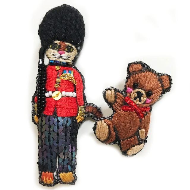 【売切】刺繍ミニブローチ 猫の衛兵とテディベア