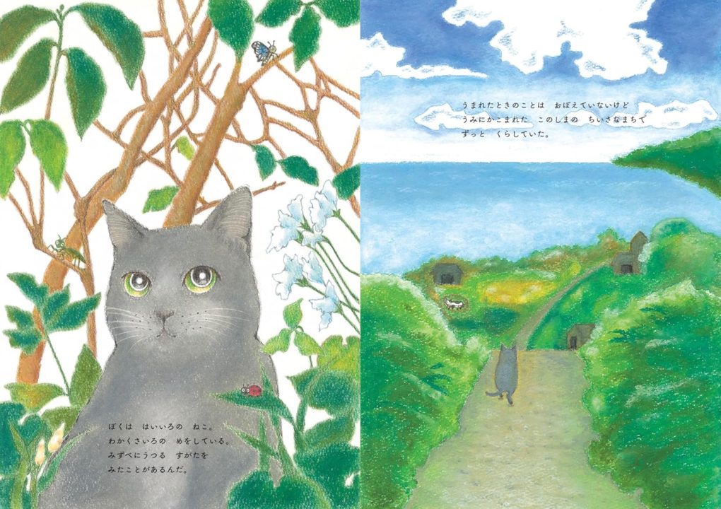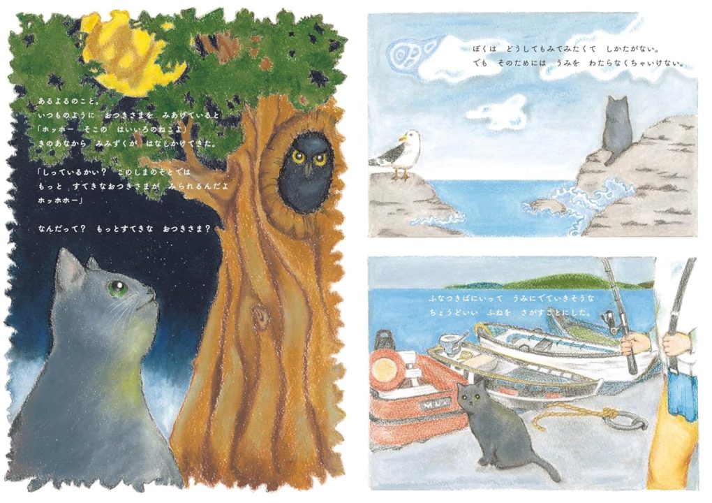 海にかこまれた小さな島で、ひとり自由気ままに暮らす灰色のねこは毎晩、えんとつにのぼってお月さまを見上げていました。