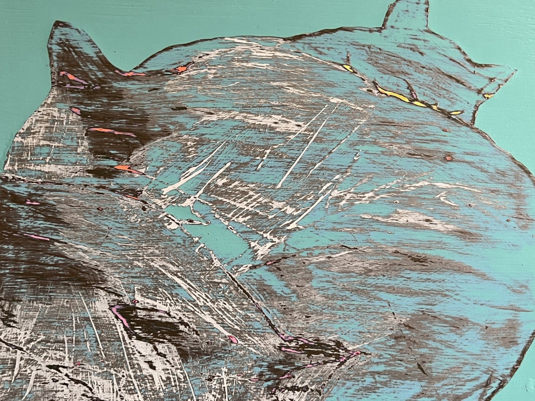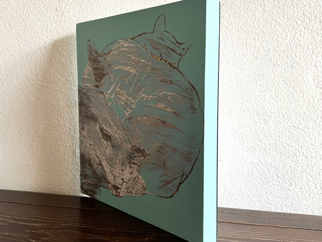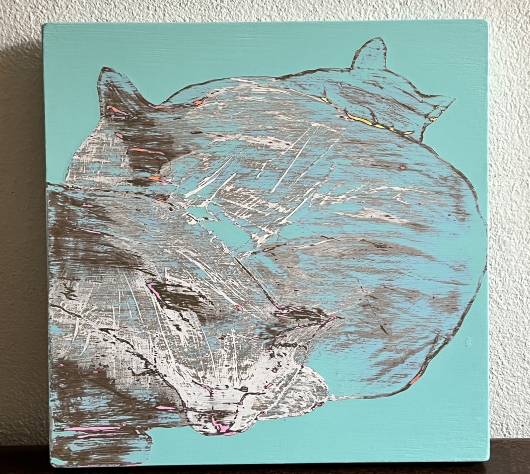 寄り添い合う猫さん達の⼀品。元ネタは⽯垣島のとあるお宅屋外にある、薪⾵呂のフタ上で巴紋様みたいに固まって寝ている猫さん達です。エレカシはずっと好きです。ライブでも定番の⼀曲をモチベーションに選んでみました。