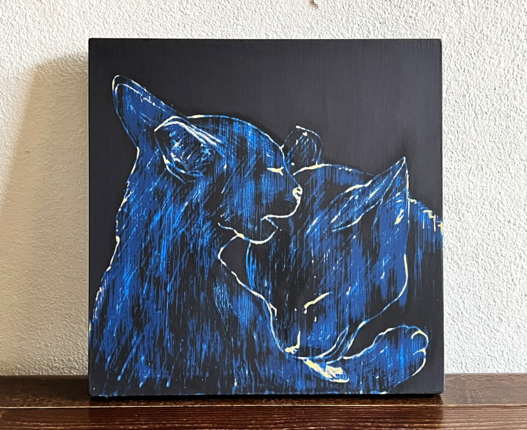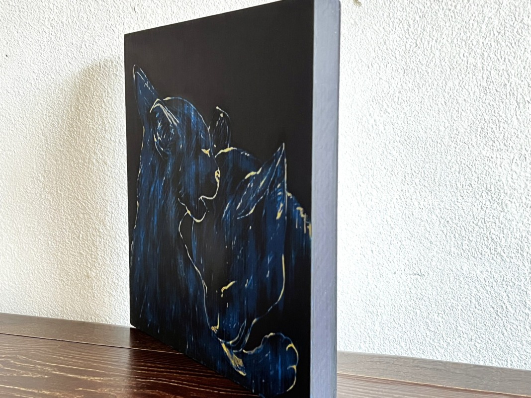 画家・藤本英明さんの手法はアクリル絵の具を何層にも塗り重ね、その上をサンドペーパーで削ってモチーフを描き出すという大変手間のかかるものです。今回は当店のためにモチーフを「猫」に限定して、新作を描き下ろして頂きました。現在沖縄在住の藤本さんが描く猫たちは、熱帯の空気をまとってゆらめく、鮮やかな色彩の森の中からふいに姿をあらわします。そしてまるで萩原朔太郎の『猫町』のように、猫路地を自由に歩き回るのです。そんな想像をしながら気ままで美しい猫たちの残像=Nekologyをご堪能ください。