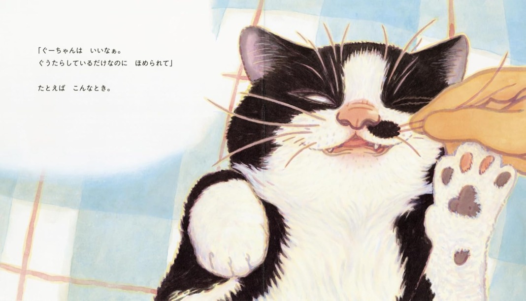 はるくんの家で飼っている猫の名前は「ぐうたら」。その名のとおりいつもぐうたらしているだけなのに、あくびをすると「かわいい!」、ご飯を食べると「えらいぞ」と、なんでもほめられます。そんなぐうたらのことを、はるくんはときどきうらやましく思っていました。ある日、はるくんが大事にしていたキーホルダーが行方不明になり、ぐうたらを連れて一緒に探すのですが――。