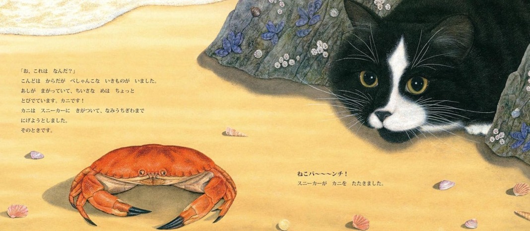 足の先が白い猫、スニーカー。好奇心旺盛なスニーカーが、初めて訪れた海でいろいろな生き物を見つけたり、波の音やにおいを感じます。マーガレット・ワイズ・ブラウンが的確に猫の本質をとらえ、アン・モーティマーが精緻な筆使いで猫の表情を描いた作品です。