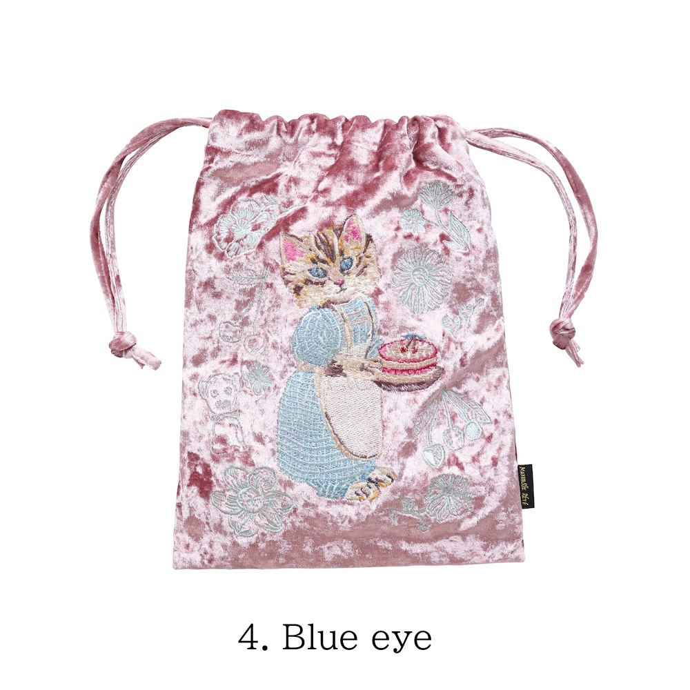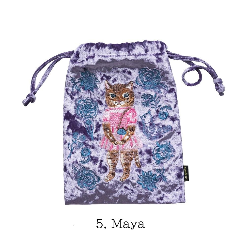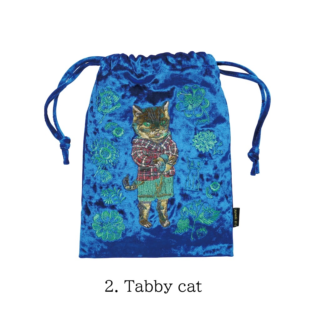 なめらかなベロア生地に、ナタリー・レテさんの愛らしい動物たちが刺繍で描かれた巾着です。