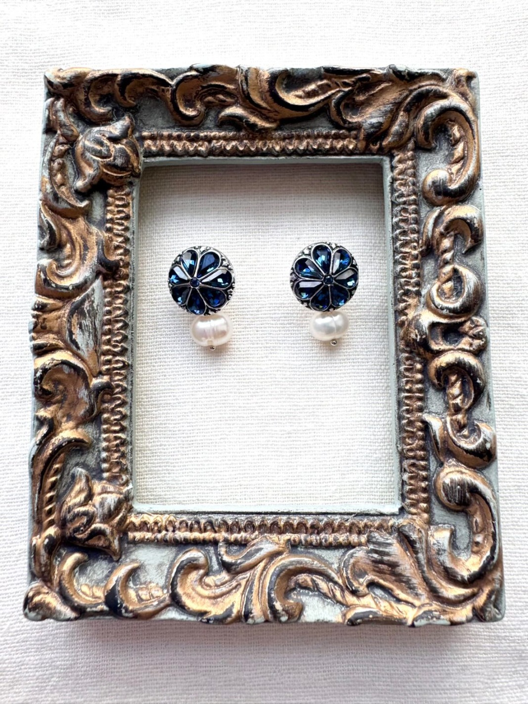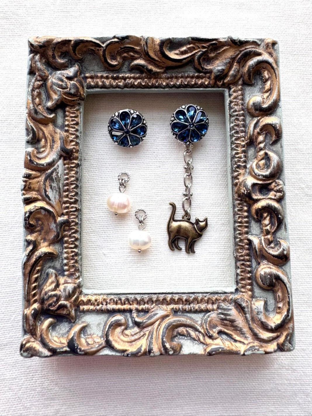 サファイアブルーのガラスがはまった本体に淡水のバロックパールを組み合わせてお使いいただける3wayのピアスです。場所や気分によって猫やパールを外したりできる便利なもの。