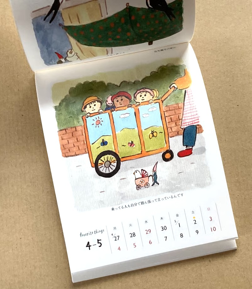 絵本作家の出口かずみさんによる描きおろしカレンダー作品集で、39種の「favorite things」が描かれていています。なんだかわからないけど好き!胸が高鳴る!活力がわく!気分が上がる!など、いろんなfavorite things(好き)があることで毎日を楽しく健やかに過ごせるのかも知れません。出口さんを中心にイトチさんともりのことさんがfavorite thingsの案を出し合ってつくられた愉快なカレンダー。