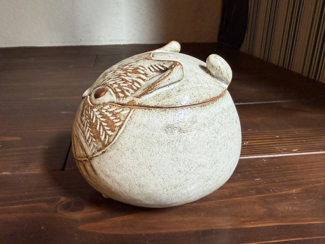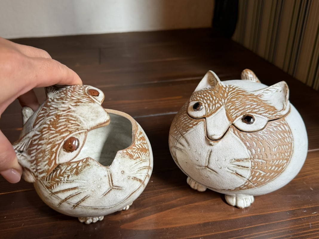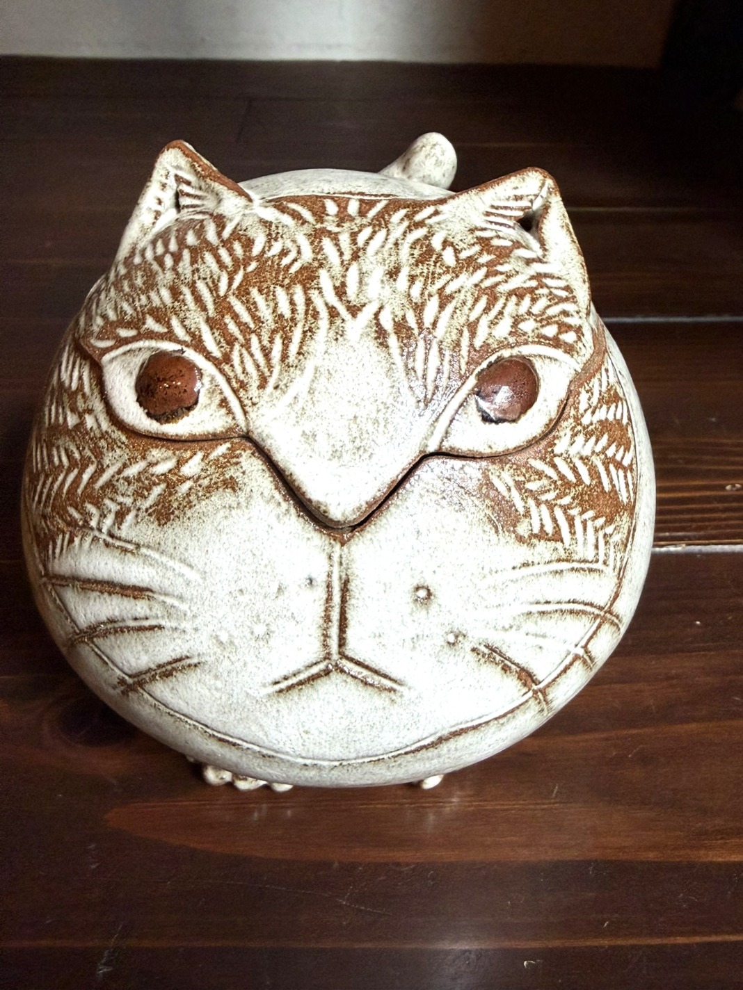陶芸家YO窯さんの新作は猫の顔のポット(物入れ)。