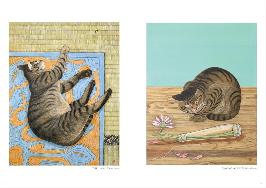 食卓の焼き魚を狙ったり、飼い主のカーディガンの上に陣取ったり、抱っこの腕から逃れようと暴れ、花瓶を倒して知らんぷり……。猫のいる日常の何気ない、けれどたまらなく愛おしい瞬間を描きます。