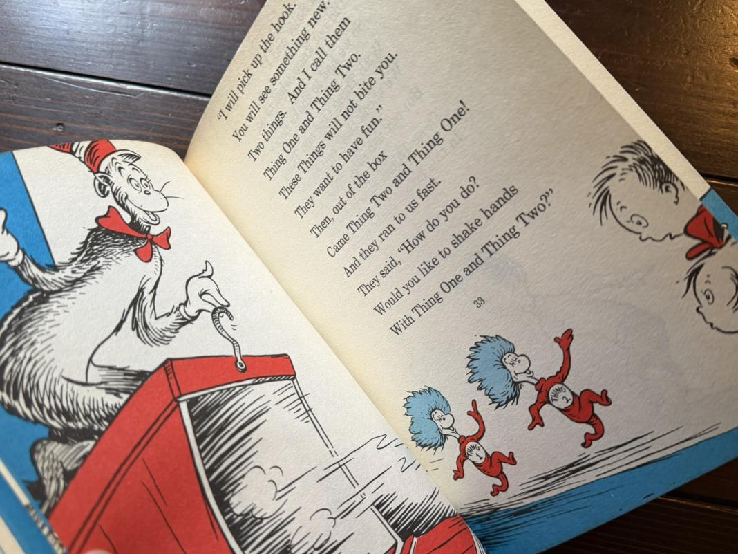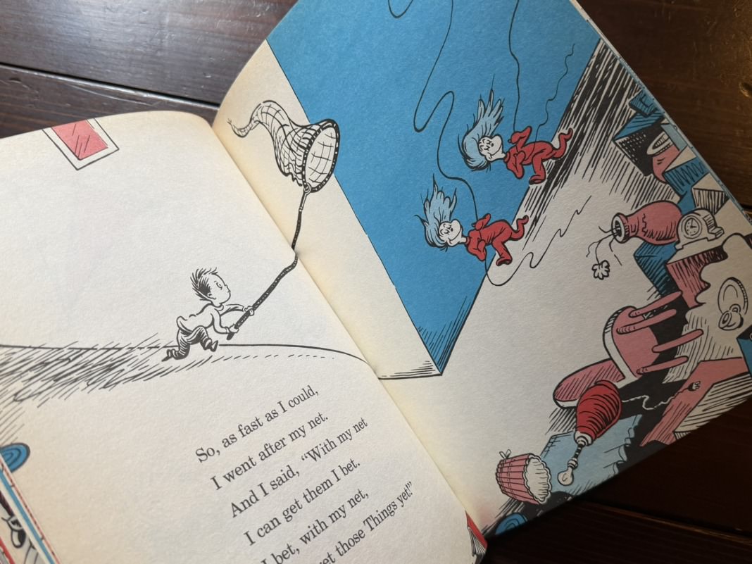 翻訳本は『キャット イン ザ ハット』。現代のマザー・グースと言われる絵本作家のドクター・スースの著作で、全世界販売部数4億5000万部という驚異的数字を生み出した人気絵本です。ある寒い雨の降る日に、「僕」と「サリー」はお家でお留守番。何もすることがなくて、退屈な時間がただ流れていくだけ。そんな日に突然あらわれたへんてこりんな「キャット イン ザ ハット」!奇想天外なねこのペースに乗せられているうちに、いつの間にか家じゅう大変なことに。そして彼が繰り広げる楽しい遊びとは・・・?
