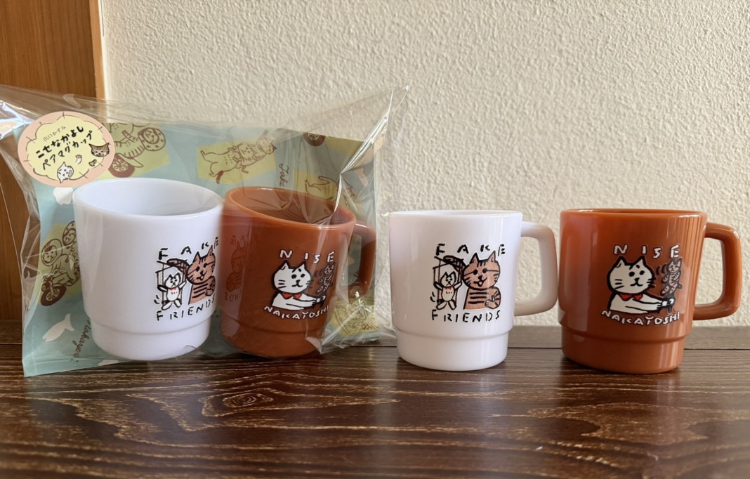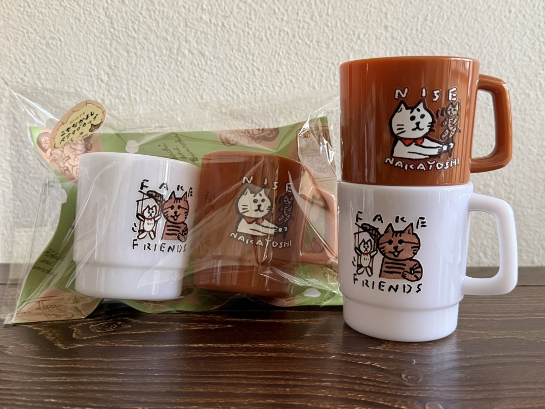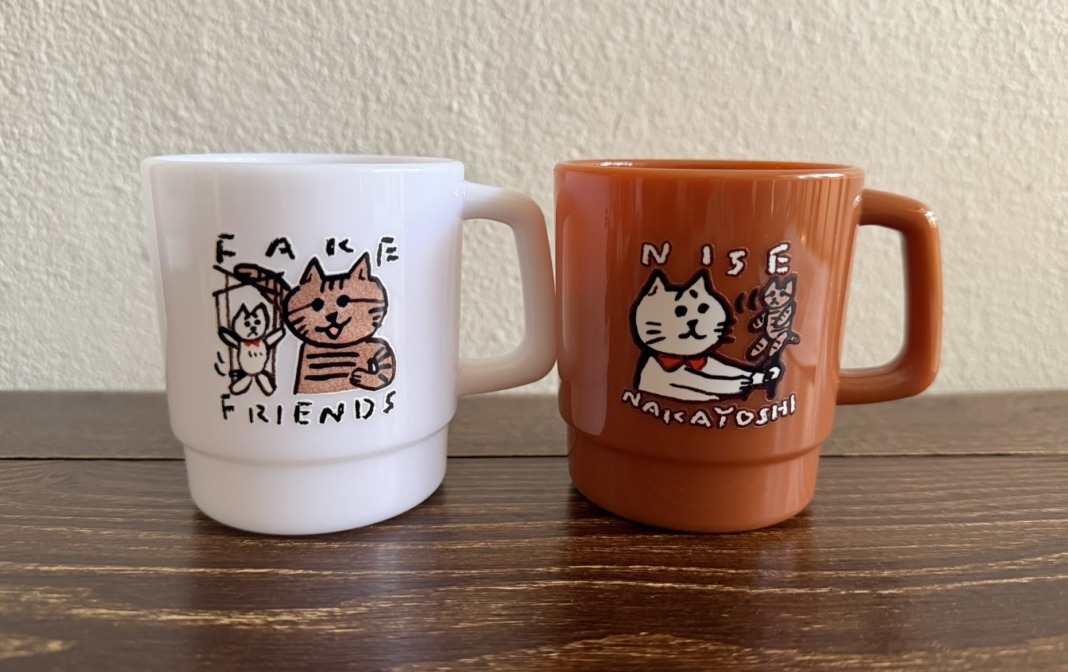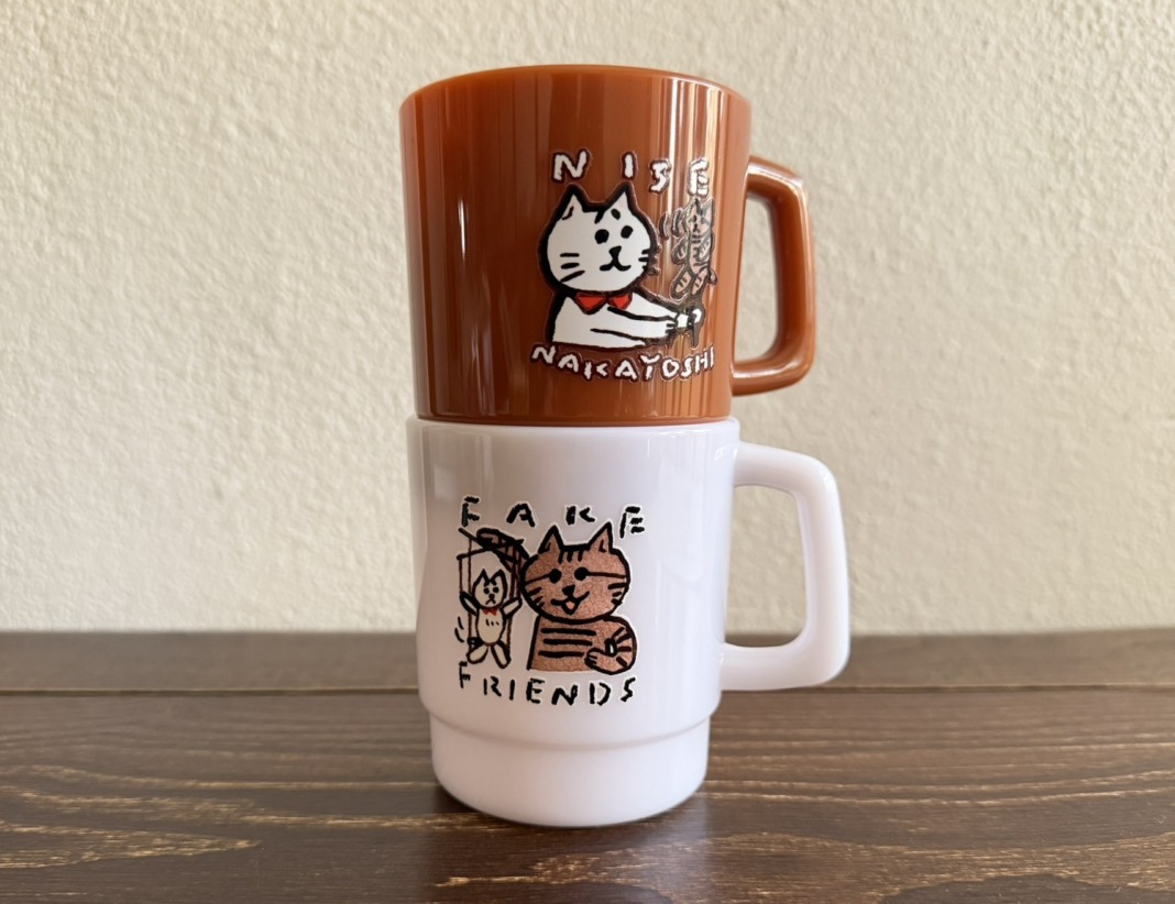 ニセなかよしがマグカップになりました! つやつやのプラスチックマグカップは230mlと少しこぶりで、コーヒーなどを淹れるのに最適です。
